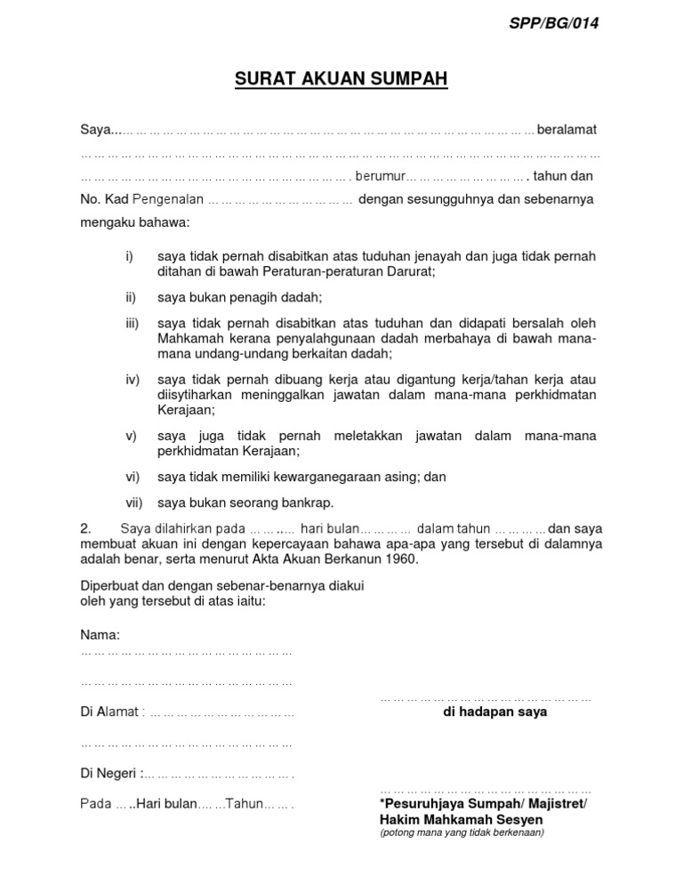 Surat akuan bersumpah daripada pesuruhjaya sumpah sekiranya pasangan tidak bekerja. Surat Akuan Memeluk Islam Bagi Mualaf 12. Dalam pada itu Norazlanshah menjelaskan kesemua 15 calon tersebut akan menandatangani surat akuan bersumpah SD dan pihaknya kini pada fasa akhir memperhalusi kandungan dokumen itu.