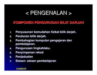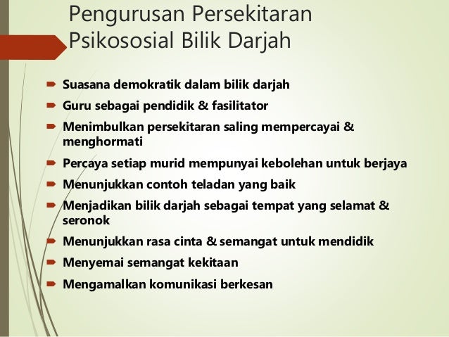 Pengurusan bilik darjah adalah istilah yang digunakan oleh guru untuk menerangkan proses memastikan pelajaran di dalam kelas berjalan dengan lancar dan berkesan walaupun pada masa yang sama berlaku gangguan daripada tingkah laku murid. Menganalisis ciri-ciri persekitaran pembelajaran yang kondusif dari aspek fizikal dan psikososial 3.